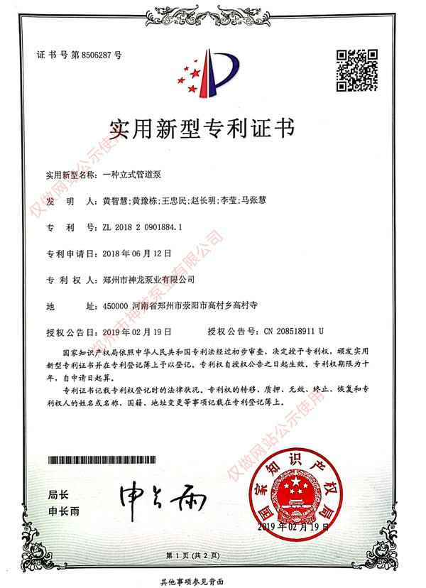 立式管道泵专利证书
